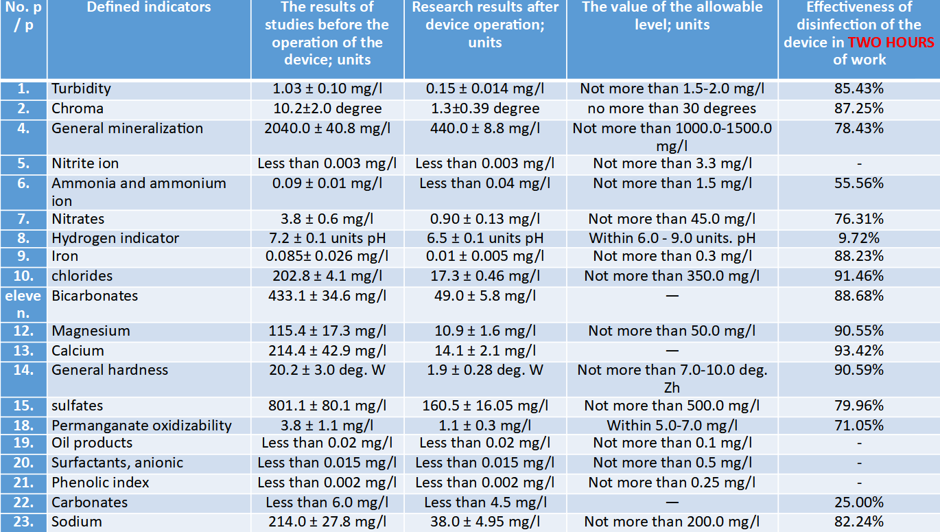 *All parameters of the device, its effect on chemical, bacterial and harmful substances, can be changed at the request of the customer, depending on the conditions, place of operation and obtaining the desired effect