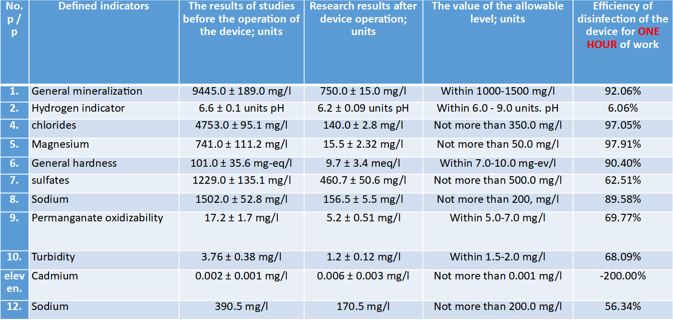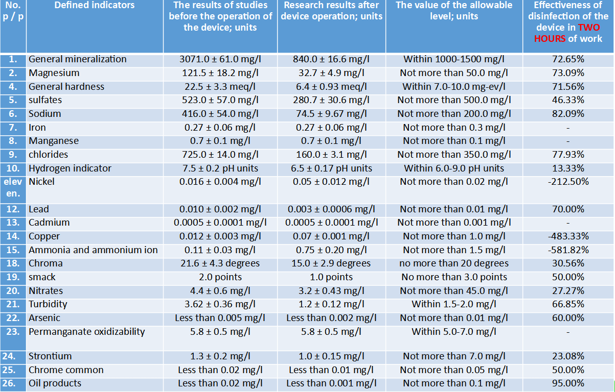 The efficiency of the devices is ensured by the impact on the resonant frequencies of chemical and bacterial compounds harmful to the human body that are in water and liquids, and their transformation into an inert environment.