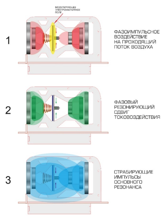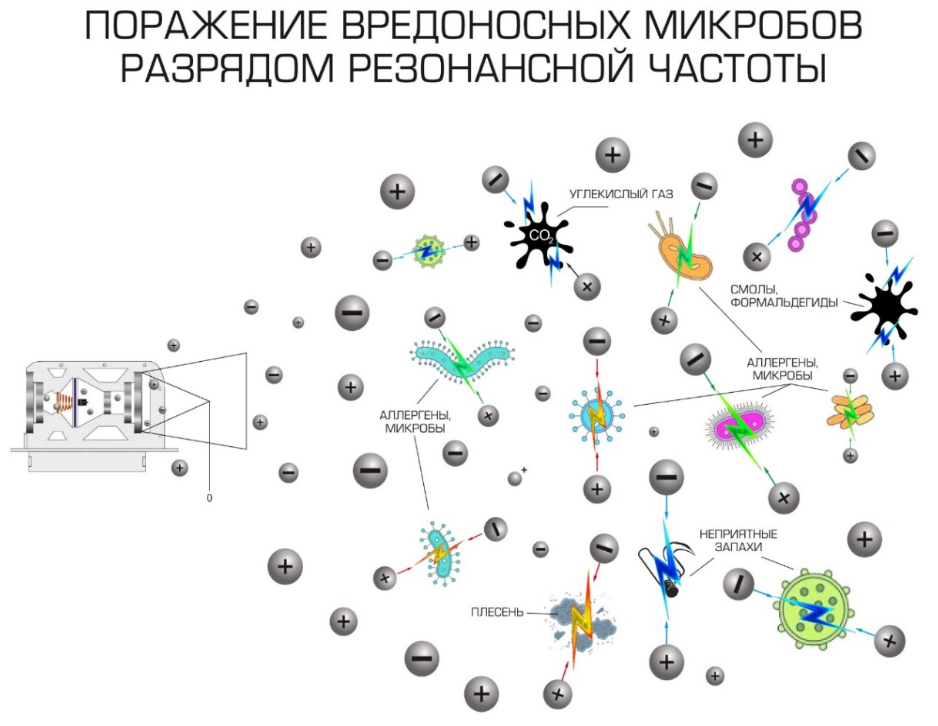 The efficiency of the devices is ensured due to the impact on the resonant frequencies of chemical and bacterial compounds harmful to the human body that are in the air and on surfaces, turning them into an inert environment
